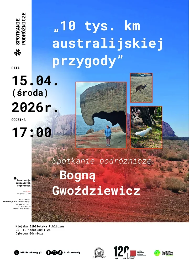 Warto zapamiętać konkrety: 15 kwietnia (środa) o godz. 17:00 w Bibliotece Głównej, ul. T. Kościuszki 25. To właśnie tam dąbrowska biblioteka zamieni się na chwilę w przystanek gdzieś między Śląskiem a Australią.