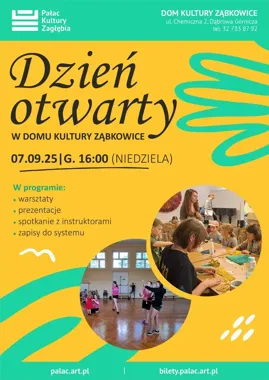 Dom Kultury Ząbkowice zaprasza na Dzień Otwarty, podczas którego będzie można zapoznać się z ofertą zajęć kulturalno-artystycznych oraz otrzymać pomoc przy zapisie do systemu zajęciowego. Wydarzenie skierowane jest zarówno do rodziców szukających zajęć dla dzieci, jak i do osób dorosłych zainteresowanych aktywnościami prowadzonymi w placówce.