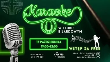 Zaproszenie na wieczór karaoke w klubie bilardowym działającym w obrębie kompleksu Nemo. Impreza odbędzie się w piątek wieczorem i jest skierowana zarówno do osób chętnych do wystąpień z mikrofonem, jak i do tych, którzy wolą oglądać i grać w bilard. Wstęp jest bezpłatny, organizator zapewnia dostęp do mikrofonu oraz muzykę.
